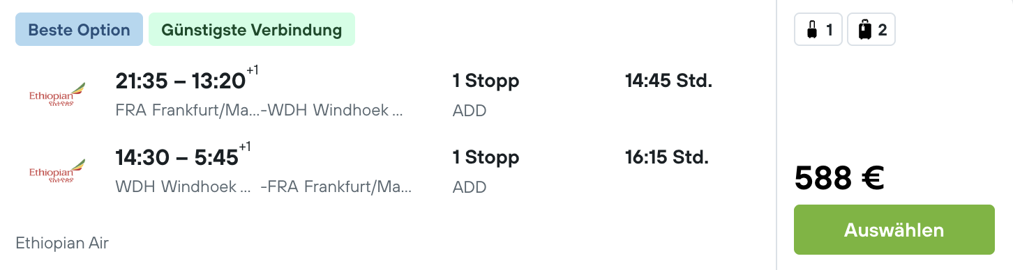 Wir haben günstige Flüge nach Namibia entdeckt - und zwar geht es nach Windhoek mit Äthiopian Airlines. Verfügbarkeiten gibt es im November und Dezember (sehr heiß, um die 30°C). Das Gepäck ist ebenfalls inklusive.