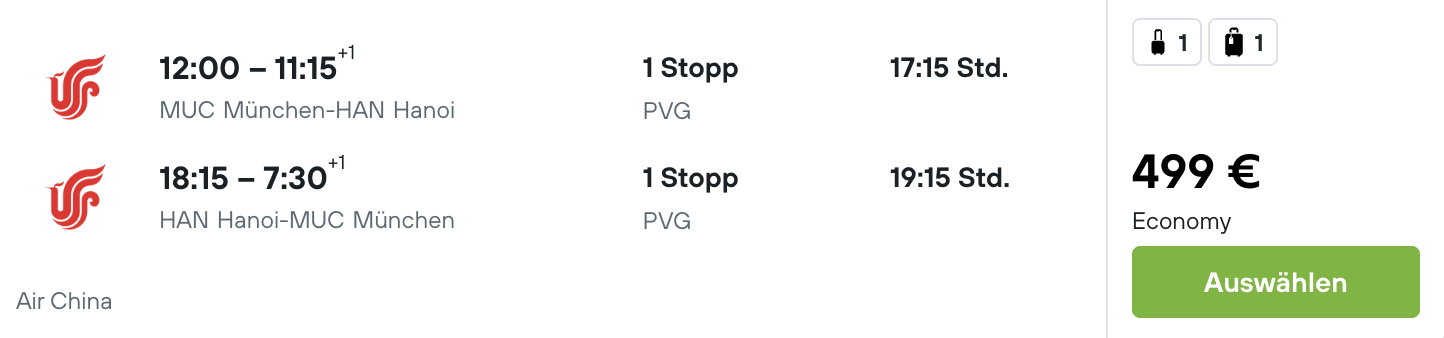 gute Nachrichten! Gerade gibt es wieder günstige Flüge nach Süd-Ost-Asien! Genau genommen geht es ab München nach Vietnam. Die Verfügbarkeit ist immer noch recht gut - von Dezember - Februar. Geflogen wird mit Air China und das Gepäck ist ebenfalls inklusive.