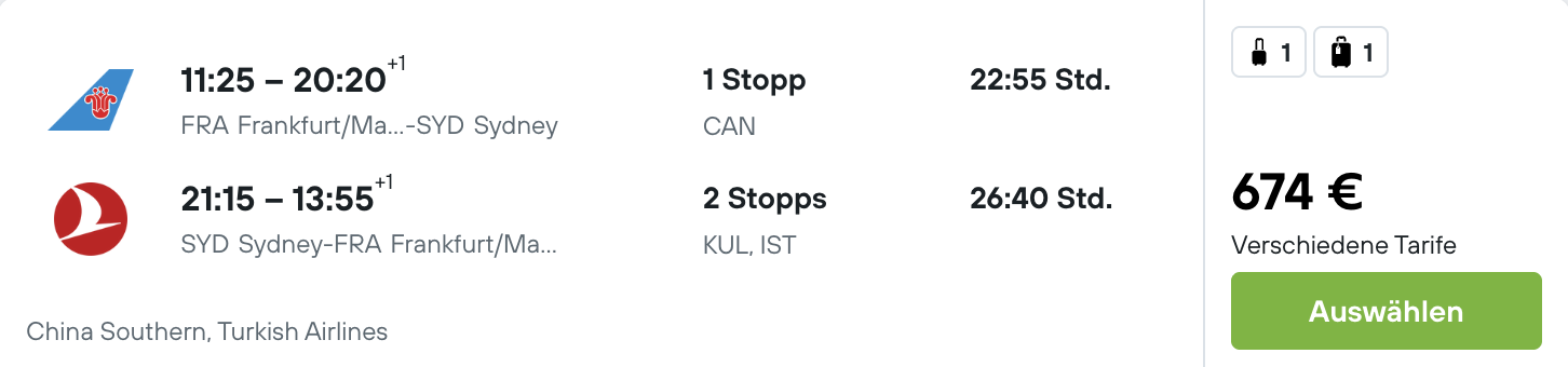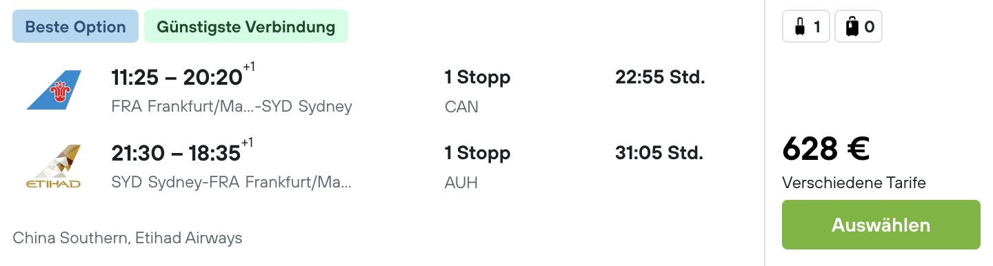 Wir sind gerade auf echt preiswerte Flüge nach Australien gestoßen. ✈️ Es geht mit China Southern und auf dem Rückflug mit Etihad oder Turkish Airlines von Frankfurt nach Sydney ab nur 628 € Return!!