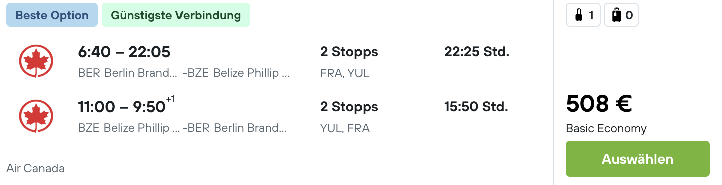 Beispiel 1: Berlin - Belize: 12.01. - 27.01.2026