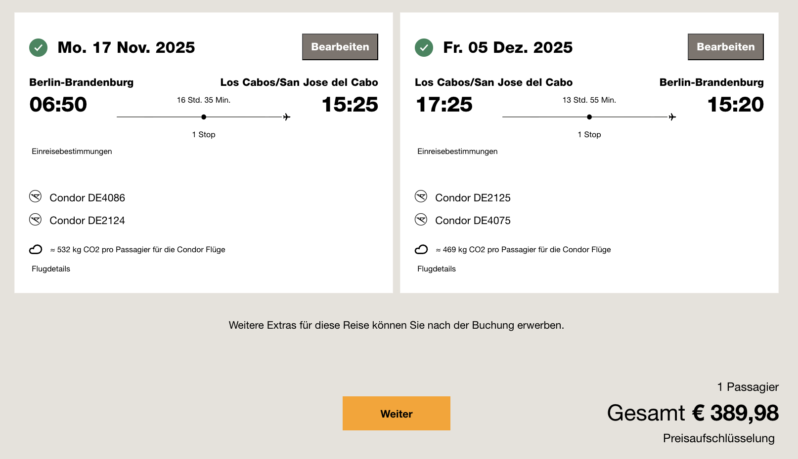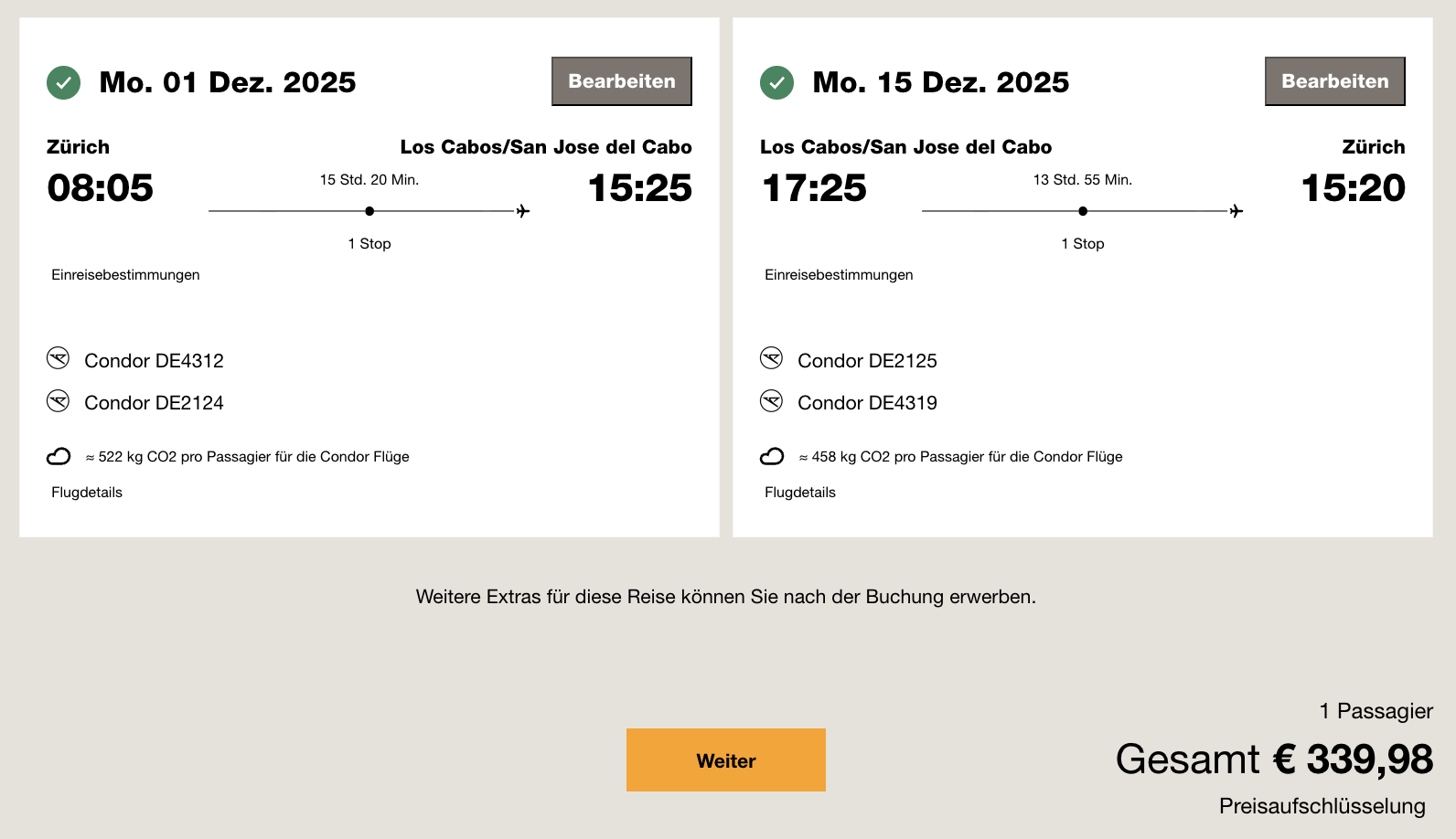 🧳 Gepäck: Aufgabegepäck ist nicht inklusive im günstigsten Tarif, für 30 € Aufpreis pro Strecke und Person ist im Economy Classic Tarif allerdings auch Gepäck mit enthalten. Alle weiteren Infos bei Condor