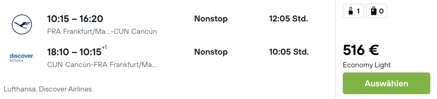 Flugbeispiel: Frankfurt - Cancun von 26.11.-17.12.2025