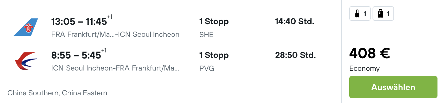 Zum Bestpreis habt ihr einen langen Zwischenstopp in Shanghai. Der Stopp ist allerdings tagsüber, so könnt ihr euch easy noch die Stadt anschauen. Für ein paar Euro mehr, gehts aber auch schon mit kurzem Stopp nach Südkorea!