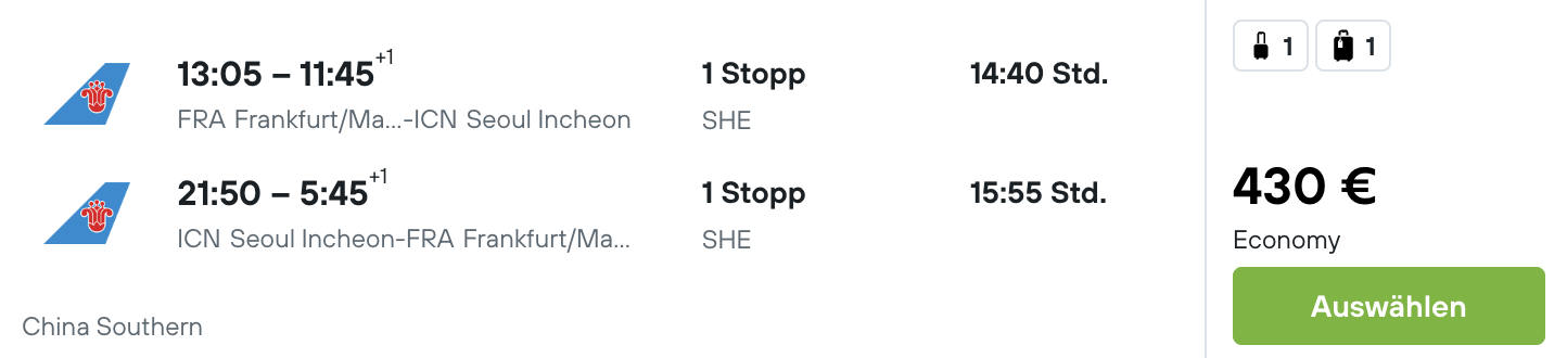 Wir haben günstige Flüge nach Südkorea entdeckt. Wer ein bisschen exotische Asien-Luft schnuppern möchte, fliegt nach Seoul bereits für unter 500€ hin und zurück und das inklusive Gepäck! Ihr fliegt mit der chinesischen Airline China Southern und/oder China Eastern.