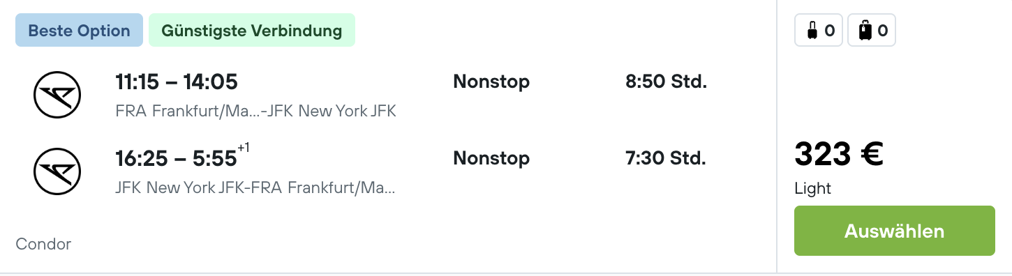 Wer hat Lust auf New York City? Im Moment bekommt ihr Direktflüge ab Frankfurt mit Condor schon ab krassen 323 € p.P im Januar. Lasst euch einfach mal weiterleiten und wählt euer Wunschdatum aus.