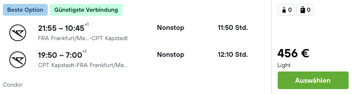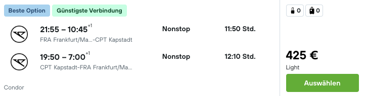 gerade gibt es wieder preiswerte Nonstop-Flüge von Deutschland nach Kapstadt. Die Preise fangen bei krassen 425 € an. Ihr fliegt mit der Condor direkt von Frankfurt nach Südafrika! Mit Umstieg in Frankfurt könnt ihr jedoch auch ab Berlin, München oder Hamburg starten. Die besten Preise gibt es mit Abflug im November und Dezember - also sogar zur Hauptsaison!