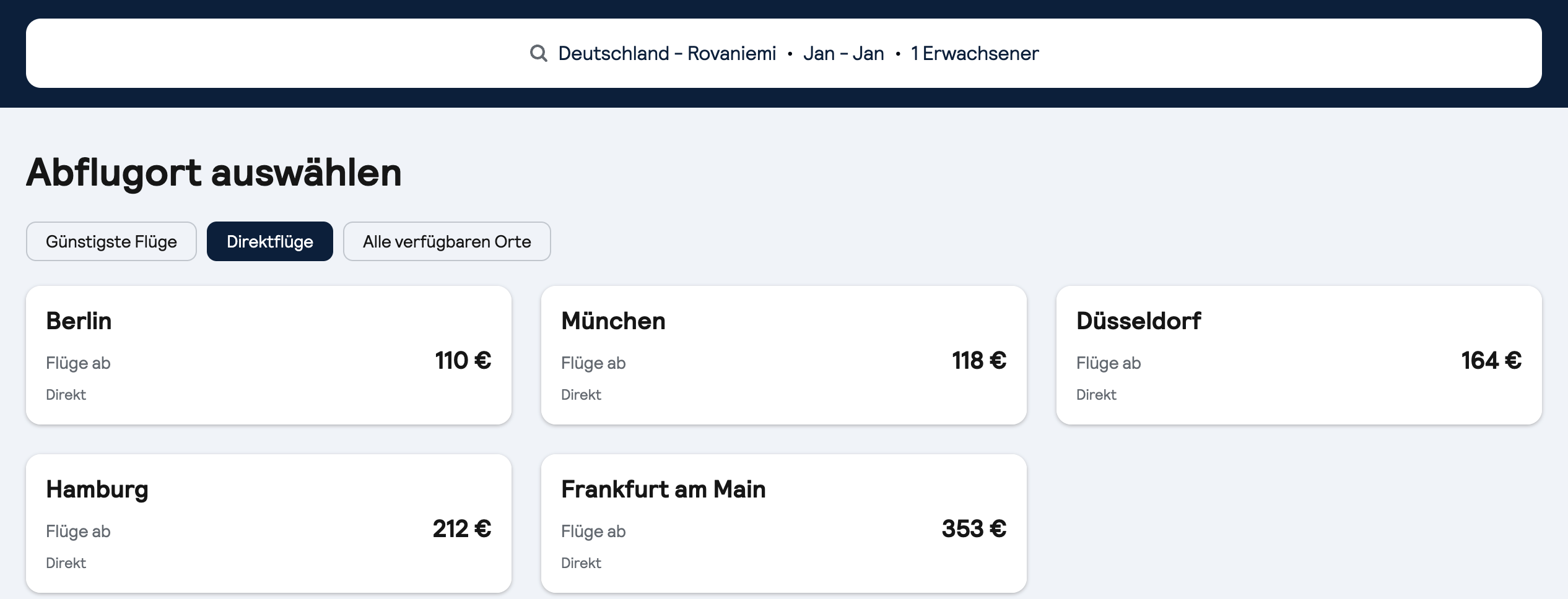 Ihr könnt nämlich Hin- und Rückflüge von 6 deutschen Abflughäfen nach Rovaniemi in Lappland schon ab nur 110 € p.P. buchen – NONSTOP!! 😍 Die besten Preise gibt es von Januar - März 2026.