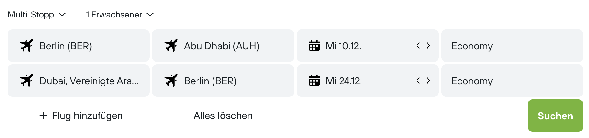 Ihr wollt lieber von Dubai zurückfliegen? Ihr bekommt die Flüge auch aktuell ab 255 € als Gabelflug. Wählt dafür oben links über "Berlin" einfach Multi-Stopp aus und gebt für den Rückflug "Dubai" als Abflugort am z.B. 24.12. an.