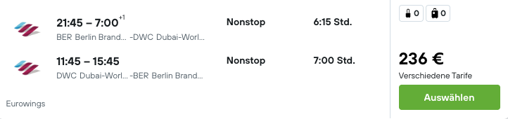 Mein Tipp: Zuschlagen bevor die Preise weg sind! Jetzt gerade im Moment habt ihr die Chance auf geniale Flüge zum noch genialeren Preis! Der Beispielflug ist im Dezember. Es gibt einige Termine zwischen November und Januar!