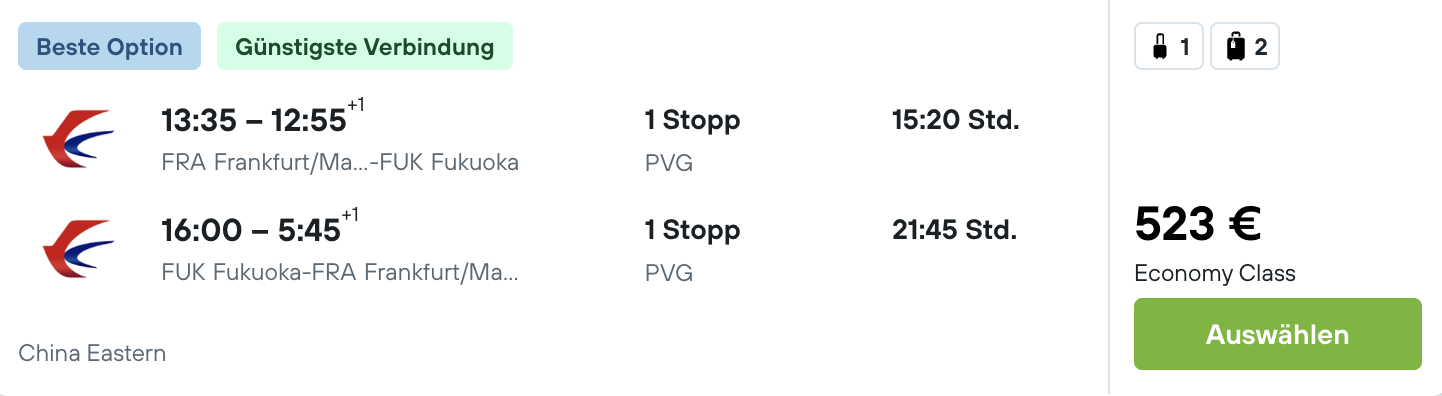 Ab Frankfurt oder München könnt ihr im Moment Flüge für nur 523€ Return nach Japan buchen. Ihr fliegt mit China Eastern, wo auch 2x 23 kg Aufgabegepäck schon mit dabei ist. Die günstigen Abflugstermine gibt es zur Zeit zwischen November und Dezember. Viel Spaß, Piraten 🇯🇵