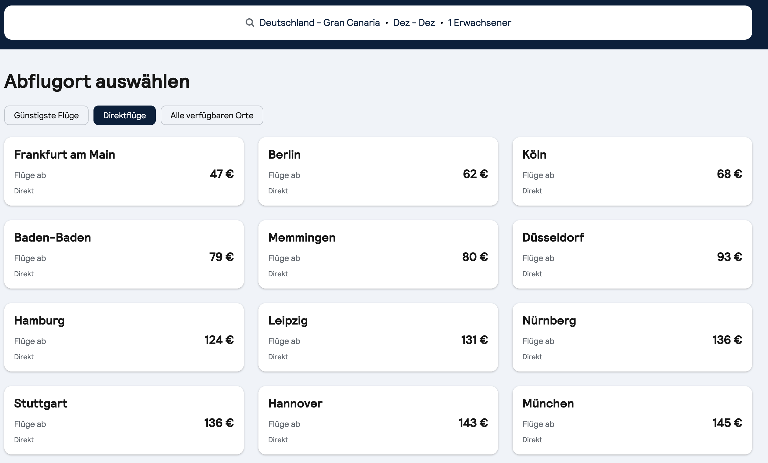 Aktuell gibt es wirklich super günstige Flüge nach Gran Canaria! Für krasse 47 € könnt ihr schon hin und zurück fliegen. Generell kommt ihr den ganzen Winter über für unter 100 € nach Gran Canaria. Direktflüge gibt es ab 14 Flughäfen in Deutschland, es sollte also für jeden was dabei sein. Schaut euch unten doch einfach mal unsere Übersicht an und lasst euch weiterleiten!