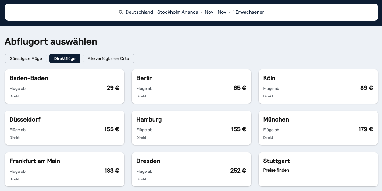 ob Köln, Baden-Baden oder Berlin: momentan könnt ihr von vielen Flughäfen preiswert in die Hauptstadt Schwedens, auch "Venedig des Nordens" genannt, fliegen. Schon ab schlanken 29 Euro gibt's den Hin- und Rückflug z.B. ab Baden-Baden. Am preiswertesten ist es im November, aber auch in vielen weiteren Monaten gibt's Termine für nur wenig Aufpreis.