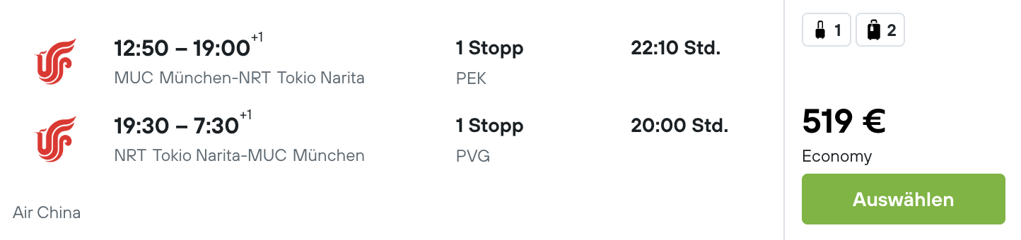 Ab München könnt ihr im Moment für 529€ Return nach Japan buchen. Ihr fliegt mit Air China, wo auch 23 kg Aufgabegepäck schon mit dabei ist. Die günstigen Abflugstermine sind ziemlich Last Minute im Juni.