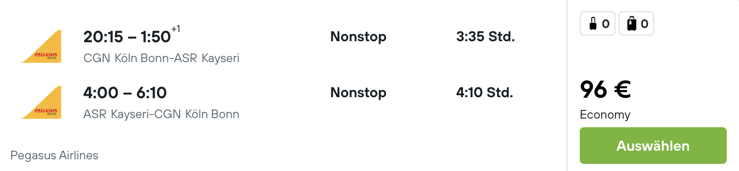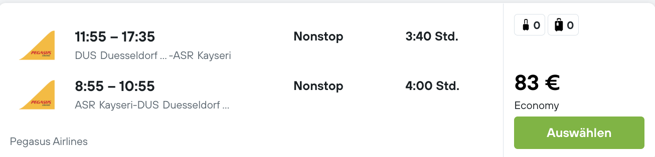 Jetzt ist der richtige Moment, um diesen Traum zu erfüllen, denn es gibt Flüge von Düsseldorf oder Köln zum einmaligen Preis ab 83 € p.P. Hin- und Zurück! Die Airline Pegasus fliegt ohne Zwischenstopp nach Kayseri. Von Kayseri sind es lediglich eine Stunde Autofahrt bis nach Kappadokien. Es gibt noch viele günstige Monate für unter 100 €! (Januar - März und Oktober)