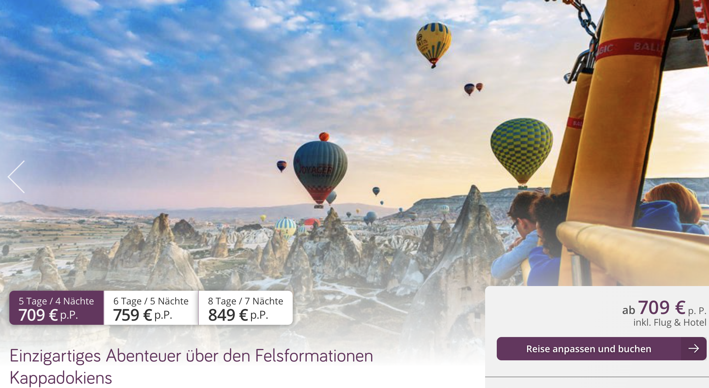 Alternativ könnt ihr das Ganze auch als Pauschalreise buchen: 4 Nächte inkl. Unterkunft, Frühstück, Flügen und jetzt kommt´s: auch eine Heißluftballonfahrt über Kappadokien ist bereits im Preis von 709 € p.P. inklusive 🤩 Haben wir euch unten verlinkt!