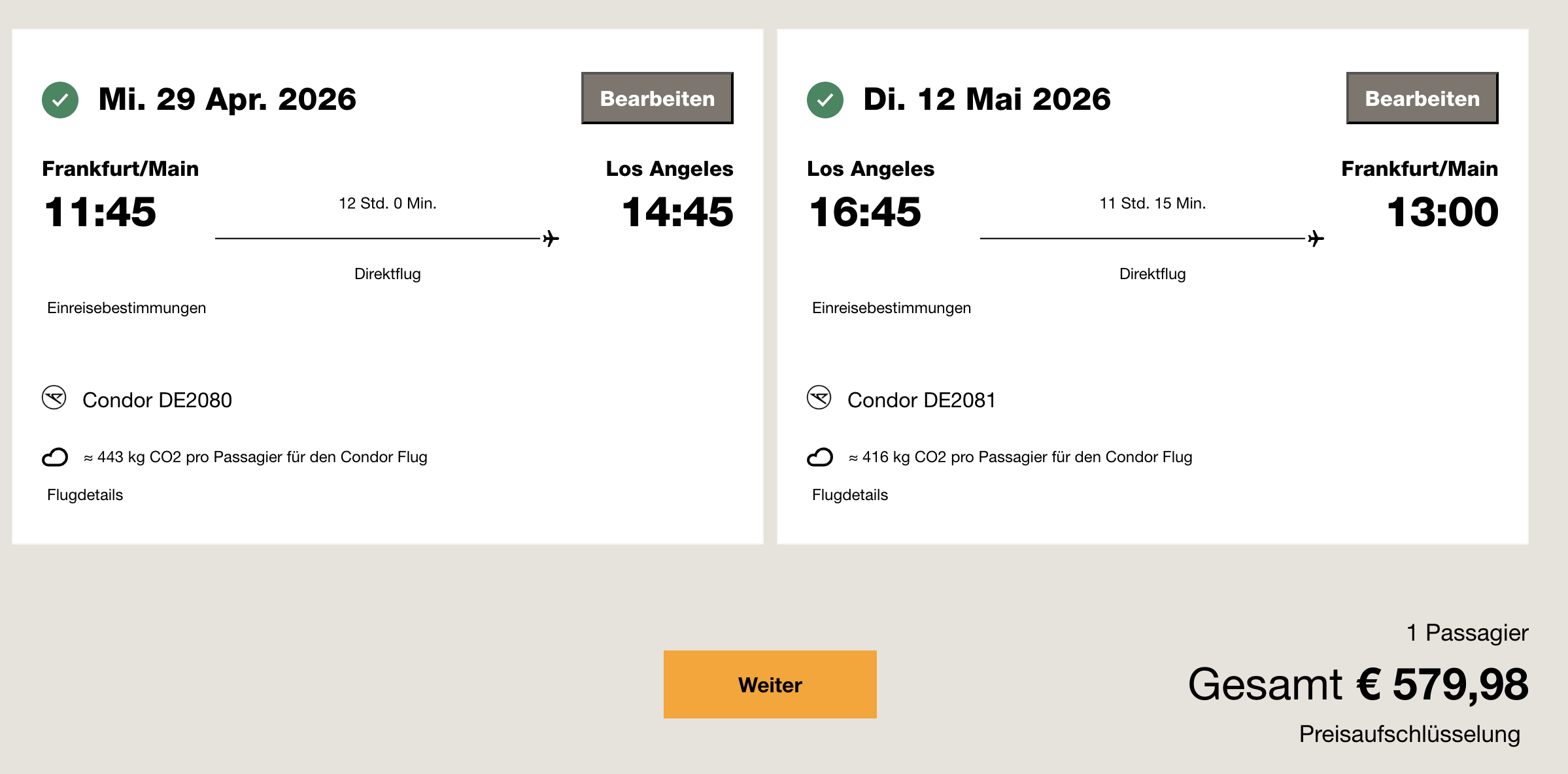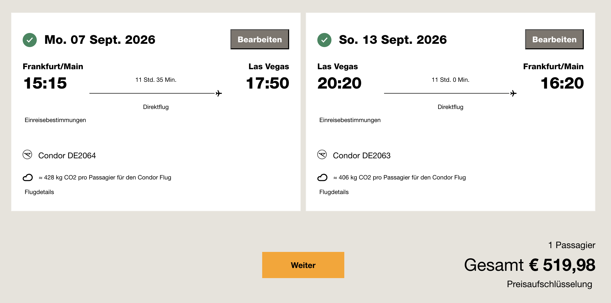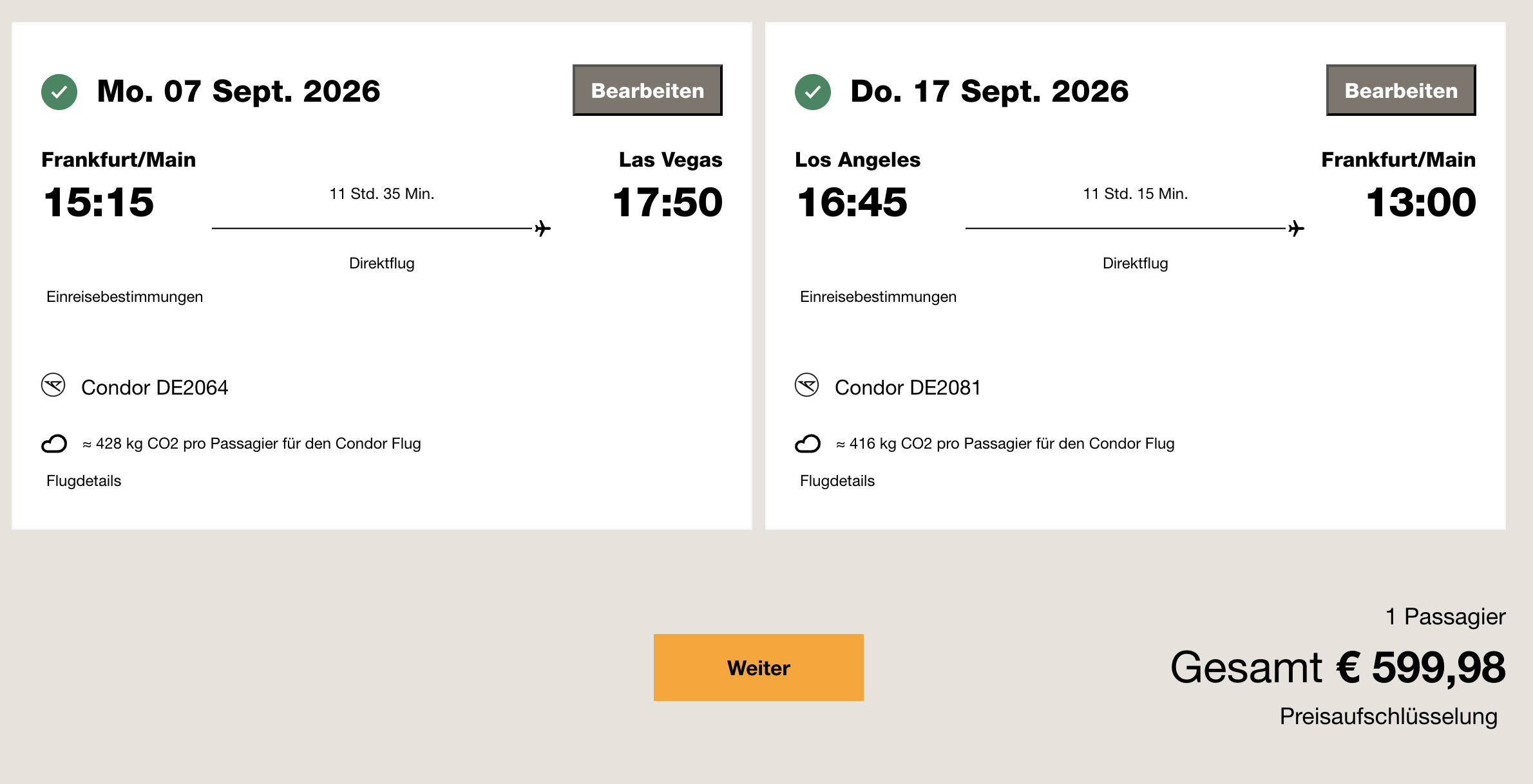 Mit der Condor könnt ihr aktuell Nonstop von Frankfurt ab 520 € nach Las Vegas oder ab 580 € nach Los Angeles fliegen. Jetzt passt aber auf: Ihr könnt auch einfach einen Gabelflug buchen und z.B. nach Las Vegas fliegen und von Los Angeles zurückreisen. So könnt ihr einen mega Roadtrip von der Wüste bis ans Meer in Kalifornien planen. Den Gabelflug gibt es bereits ab nur 600 € p.P.