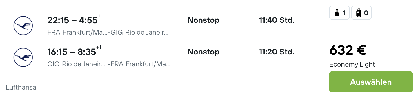 WOW, da haben aber was entdeckt! Flüge nach Rio sind bekanntlich nicht gerade günstig. Und wenn man mal was für unter 800€ findet, dann fliegt man meistens mit Umstieg. Doch gerade gibt es ein paar Termine mit Lufthansa nach Brasilien ab nur 632 Euro hin und zurück. Hier fliegt ihr NONSTOP von Frankfurt.