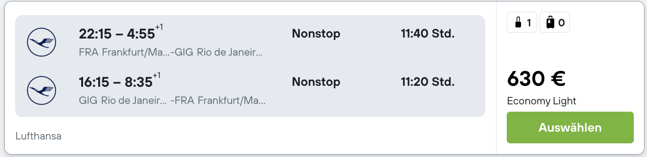 WOW, da haben aber was entdeckt! Flüge nach Rio sind bekanntlich nicht gerade günstig. Und wenn man mal was für unter 800€ findet, dann fliegt man meistens mit Umstieg. Doch gerade gibt es ein paar Termine mit Lufthansa nach Brasilien ab nur 630 Euro hin und zurück. Hier fliegt ihr NONSTOP von Frankfurt.
