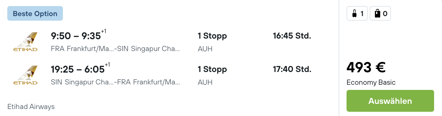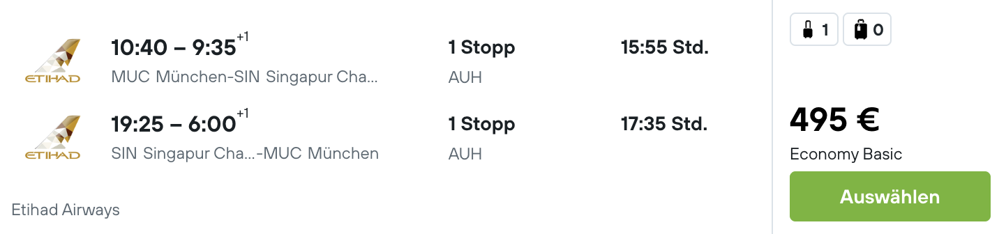 Gerade gibt es günstige Flüge mit Etihad Airways ab München und Frankfurt nach Singapur. Geflogen wird mit einem Zwischenstopp in Abu Dhabi. Los geht's ab 488 €.