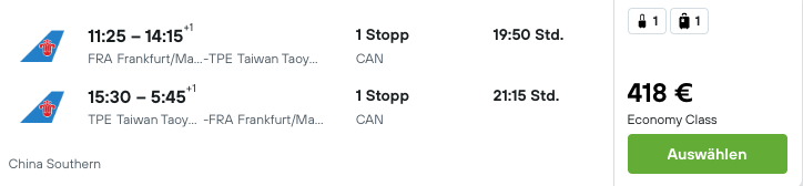 Und das Beste ist: Momentan fliegt ihr nach Taipeh ab 418€ hin und zurück ab Frankfurt. Ihr fliegt dabei mit China Southern, wo sogar das Aufgabegepäck mit dabei ist! Den Bestpreis findet ihr z.B. im Dezember