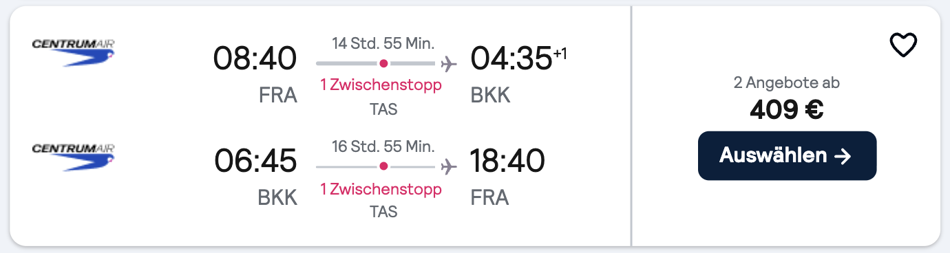 Ab nur knapp über 400 Euro für Hin- und Rückflug kommt ihr von Frankfurt nach Bangkok und zurück mit der Airline Centrum Air. 8 kg Handgepäck ist inkludiert und der Flug geht über Usbekistan mit lediglich um die 15 Stunden Flugzeit.