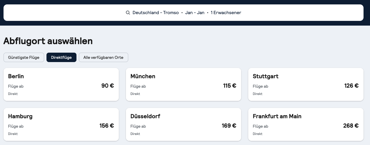 Mit Norwegian und teilweise auch Easyjet könnt ihr nämlich Hin- und Rückflüge von 6 Flughäfen nach Tromso schon ab nur 90 € p.P. buchen – NONSTOP!! 😍 Die besten Preise gibt es zwischen Januar und April.