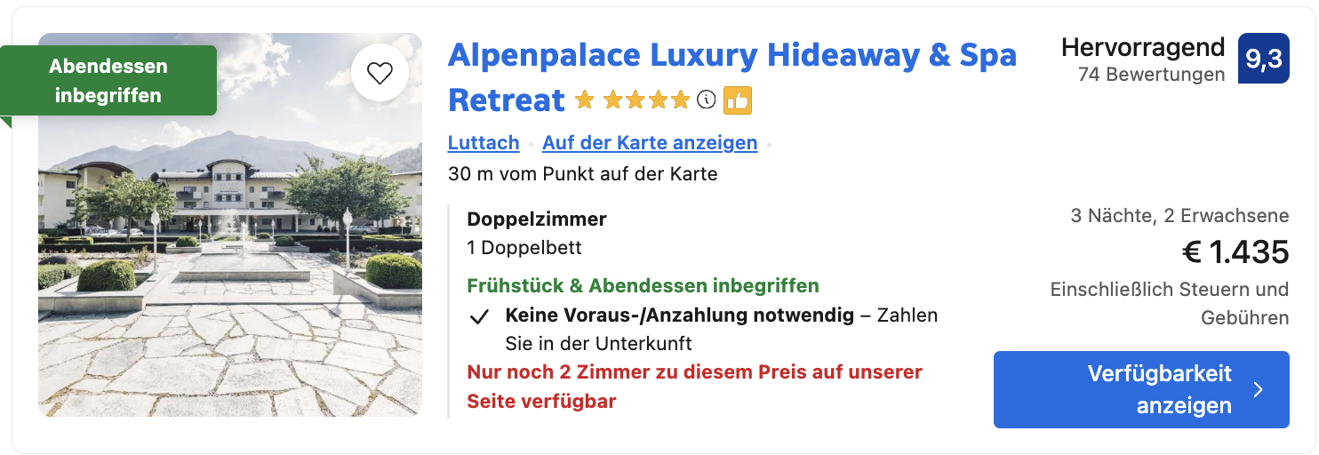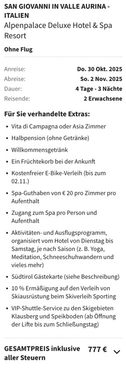 Wie immer haben wir die Preise verglichen und eine krasse Ersparnis festgestellt. Denn bei Booking zahlt ihr für die 3 Nächte inkl. Halbpension 1.435€. Bei Voyage Privé hingegen nur 777€! Zudem bekommt ihr das Vita di Campagna oder Asia Zimmer mit 5 m² mehr, 20€ Spa-Guthaben, E-Bike Verleih, und diverse weitere Extras obendrauf! Somit spart ihr hier mind. 658€, also knapp 46% – KRASS!!!