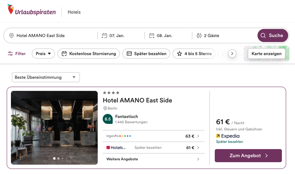 Ahoi Piraten! Wer Lust auf einen Trip nach Berlin hat, kann sich aktuell über gute Hotelpreise freuen. So bekommt ihr beispielsweise die Übernachtung im stylischen AMANO East Side ab um die 30€ pro Person bei einer Reise zu zweit.