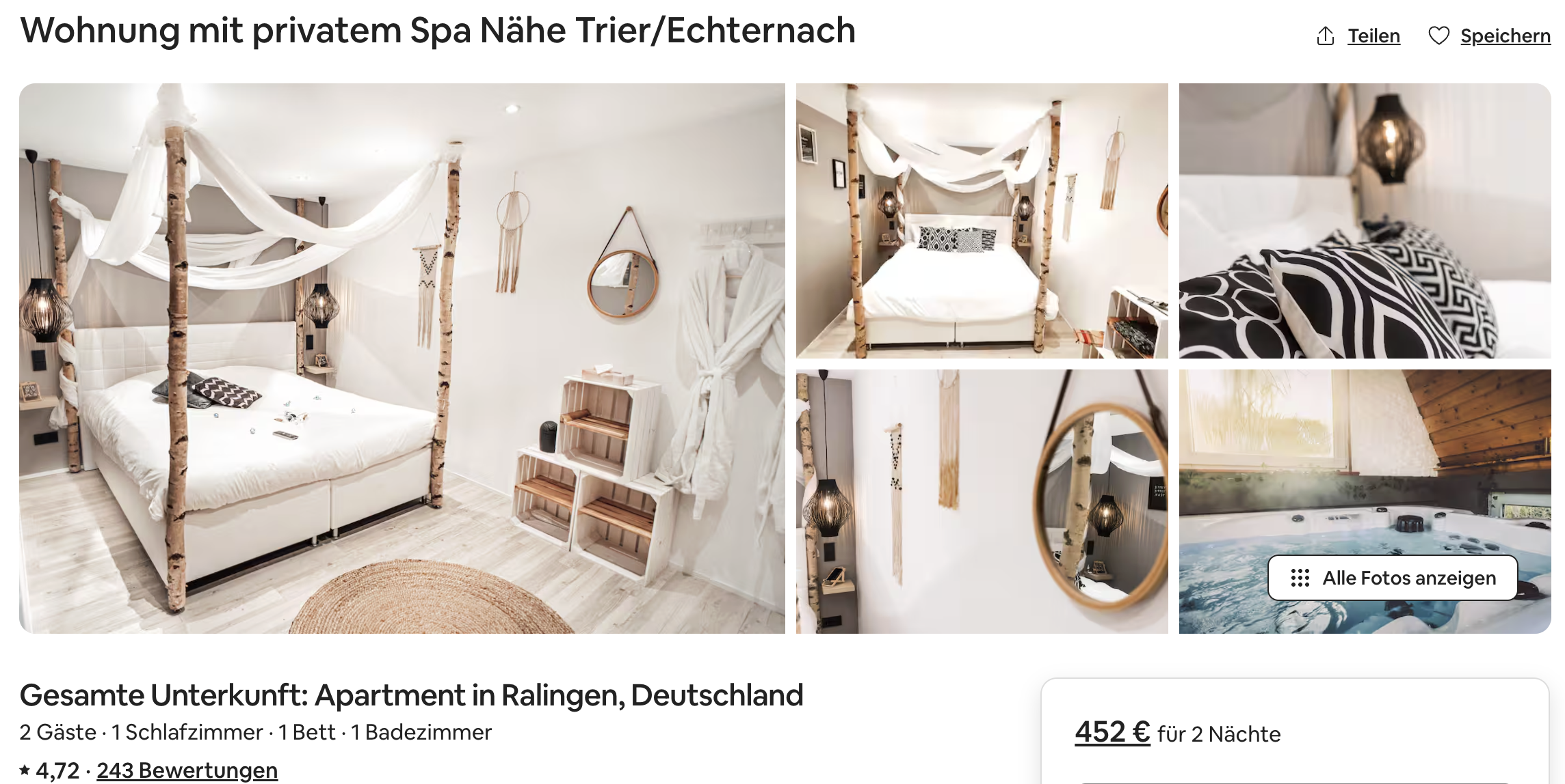 Es befindet sich in Ralingen, in der Nähe von Trier. In der stylisch als auch gemütlich eingerichteten Wohnung findet ihr einen Garten mit Whirlpool und eine Sauna. Außerdem ist die Unterkunft mit einem King Size Bed, einer hochwertigen Küche, coolen Gadgets wie zwei gemütlichen Hängesesseln sowie einem Bad mit Erlebnis-Dampfdusche eingerichtet. Das Apartment erstrahlt im schicken Boho-Style und im Garten (mit Feuerstelle!) könnt ihr euch ein bisschen wie auf Bali fühlen.