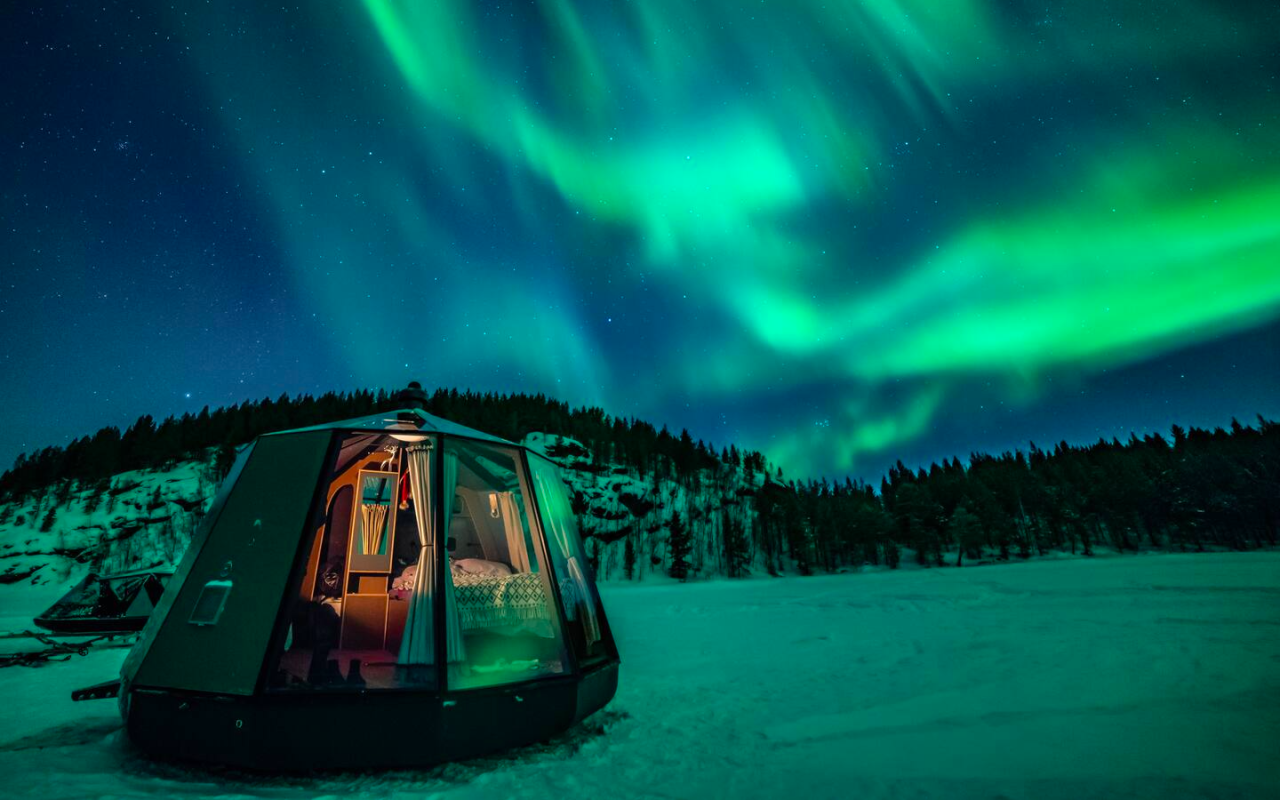 Erlebt ein magisches Erlebnis in Schwedisch Lappland, indem ihr in einer Glaskuppel auf einem zugefrorenen See übernachtet, der von magischen Schneelandschaften umgeben ist. Die Definition von Glamping, welches die Natur, Komfort und Luxus verbindet. Da die Unterkunft komplett verglast ist, habt ihr einen Platz in der ersten Reihe, um die Nordlichter zu beobachten, die im Allgemeinen zwischen Oktober und März sichtbar sind.