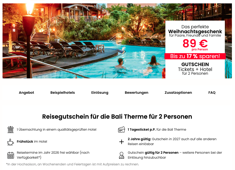 Und wer jetzt denkt, sowas könnte man doch auch schön verschenken: Bei Travelcircus erhaltet ihr momentan einen Gutschein für den Eintritt in die Bali Therme plus eine Übernachtung in der Umgebung, in der Regel inkl. Frühstück, ab nur 89€ pro Person! Einlösbar ist dieser im Jahr 2026 und auch 2027 verfällt er nicht, sondern verwandelt sich in einen Wertgutschein, einlösbar auf alle Travelcircus-Produkte.
