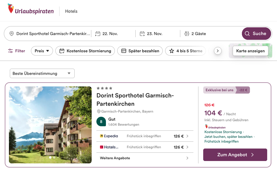 Besonders attraktiv ist ein Aufenthalt im Herbst. Denn in der Nebensaison sind die Preise im Dorint Sporthotel Garmisch-Partenkirchen selbst am Wochenende erstaunlich fair. Über die Urlaubspiraten Hotelsuche lässt sich außerdem noch einmal deutlich sparen. Wer clever bucht, sichert sich Alpenidylle und Komfort zu einem wirklich attraktiven Preis.