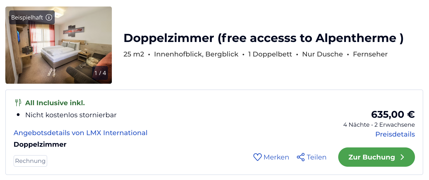 Bei diesem Deal zahlt ihr ab 189 € pro Person für 3 Nächte im Doppelzimmer und inklusive Thermeneintritt für jeden Tag, beispielsweise vom 24. - 27. November. Auf anderen Portalen dagegen zahlt ihr mindestens 317,50 € pro Person.