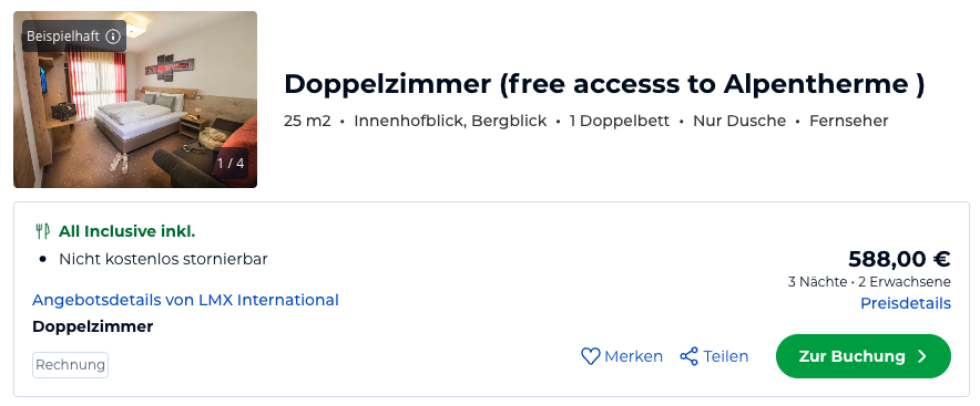 Bei diesem Deal zahlt ihr ab 249 € pro Person für 3 Nächte im Doppelzimmer und inklusive Thermeneintritt für jeden Tag, beispielsweise vom 16. - 19. April. Auf anderen Portalen dagegen zahlt ihr mindestens 294 € pro Person.