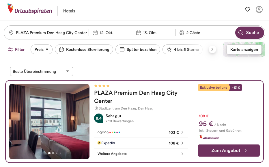 Gut und günstig geht's mit diesem Deal. Für eine Übernachtung im top zentralen 4* PLAZA Premium Den Haag City Center werden nämlich keine 50€ pro Person fällig. Gegen Aufpreis könnt ihr auch das Frühstück hinzubuchen.