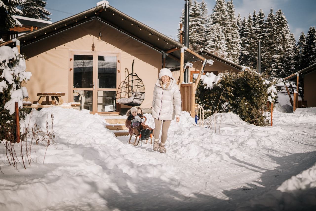 Die luxuriösen Glampingzelte sind mit "echten Wänden", die mit Zeltstoff bespannt sind und einem Pelletofen ausgestattet. Im Inneren findet ihr zwei komfortable Schlafzimmer (eines mit einem Doppelbett und eines mit einem Etagenbett + einem Einzelbett), eine Küche mit Herd sowie ein Badezimmer mit Dusche, Waschbecken und Toilette.