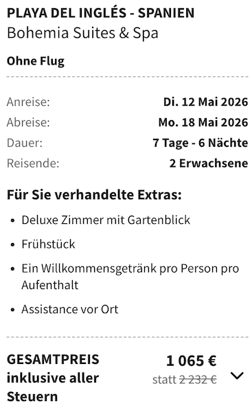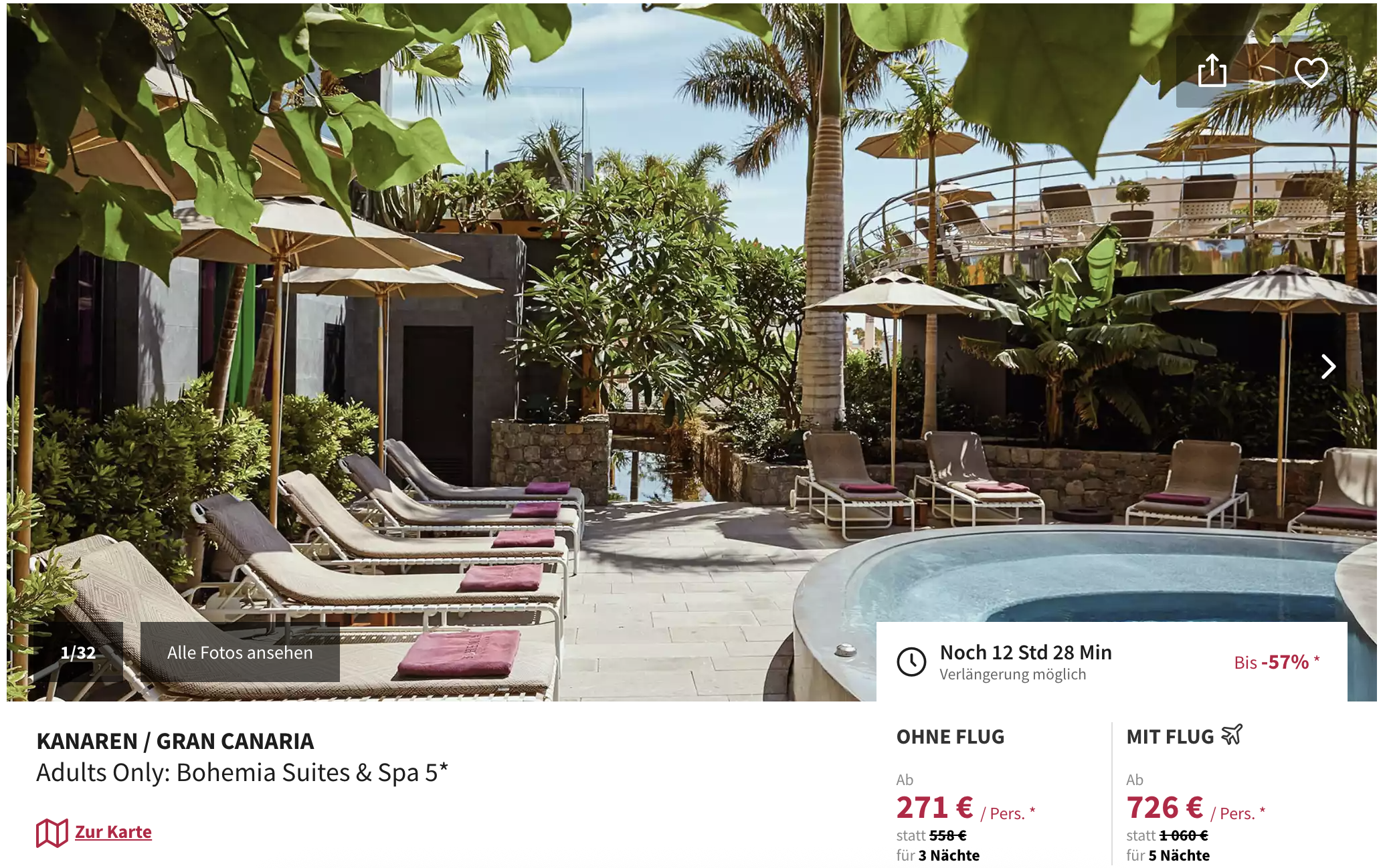 Wir haben gerade wieder bei Voyage Privé einen klasse Deal entdeckt, den müssen wir euch einfach zeigen. Es geht ins traumhafte 5* Bohemia Suites & Spa, ein Erwachsenenhotel auf Gran Canaria.