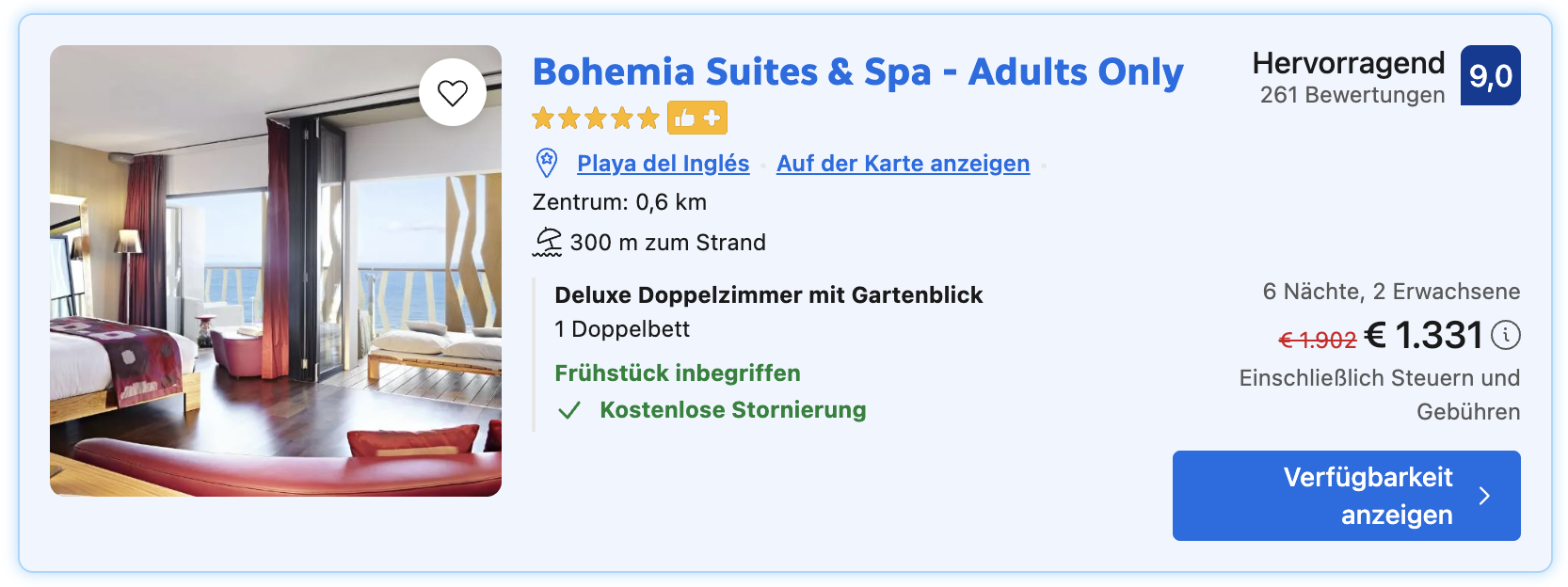 Schon genial, dass ihr in so einem erstklassigen Hotel gerade mal 533€ p.P. für eine Woche bezahlt. Dabei kommt ihr im Deluxe Zimmer mit Gartenblick unter und habt auch das Frühstück bereits inklusive. Bleibt ihr noch länger, bekommt ihr auch noch andere Extras und Rabatte on top! Den Besten Preis bekommt ihr aktuell als Frühbucher im Mai - August 2026. Aber auch für diesen Herbst / Winter gibt's noch Termine mich recht wenig Aufpreis.