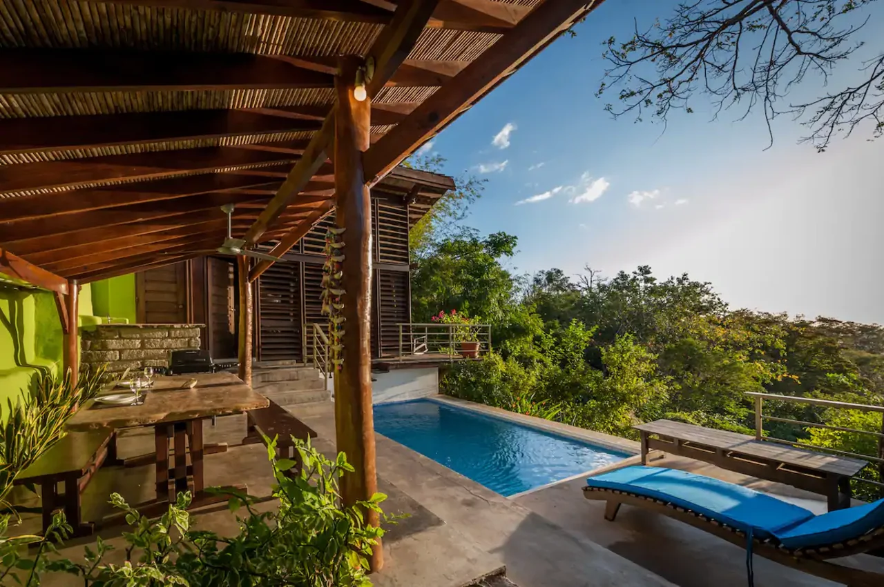 Das Casa La Serena ist ein atemberaubendes Haus im Boho-Stil mit 2 Schlafzimmern, 2,5 Badezimmern, Meer- und Dschungelblick und einem privaten Pool.
