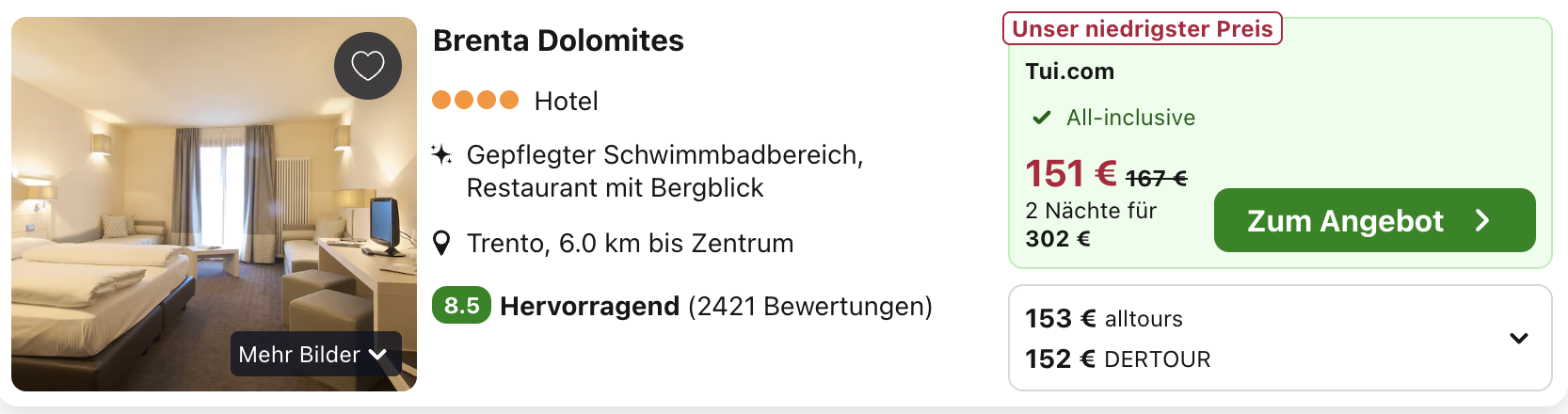 Bei einem Aufenthalt vom 15. - 17. Mai zahlt ihr bei uns zu zweit einen Gesamtpreis von 286€ & 50€-Wellnessgutschein Bucht ihr dagegen woanders, zahlt ihr 302€.