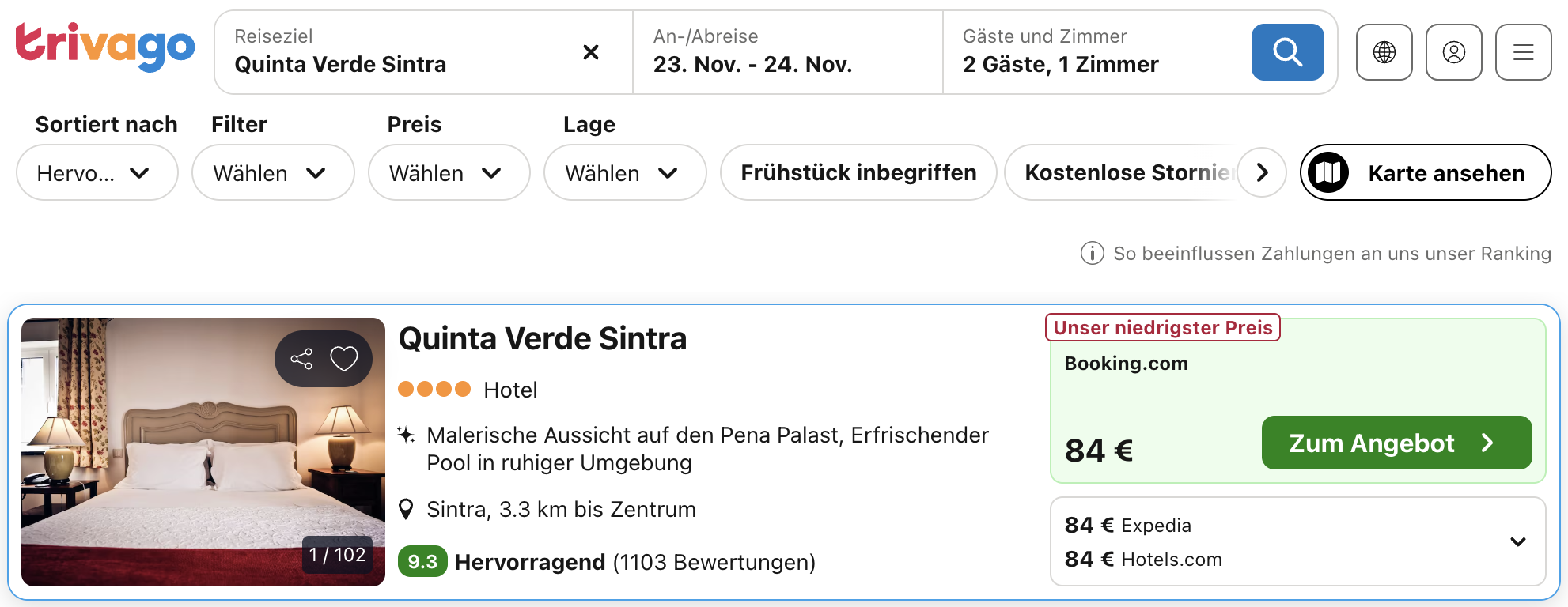 An unserem Beispieltermin bekommt ihr die Nacht schon ab 84€ bei lol.travel, also 42€ pro Person. Lasst euch einfach dorthin weiterleiten.