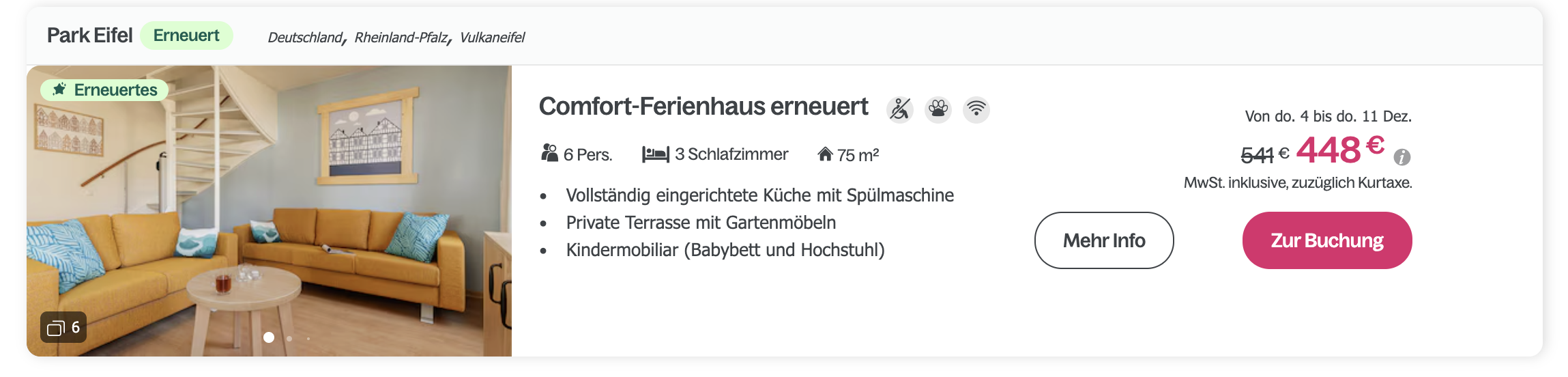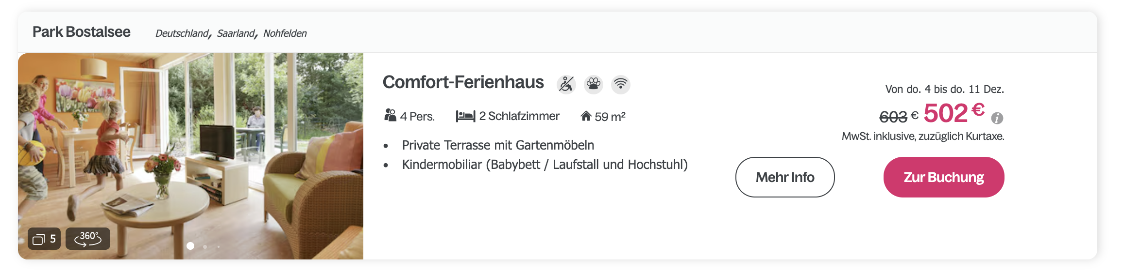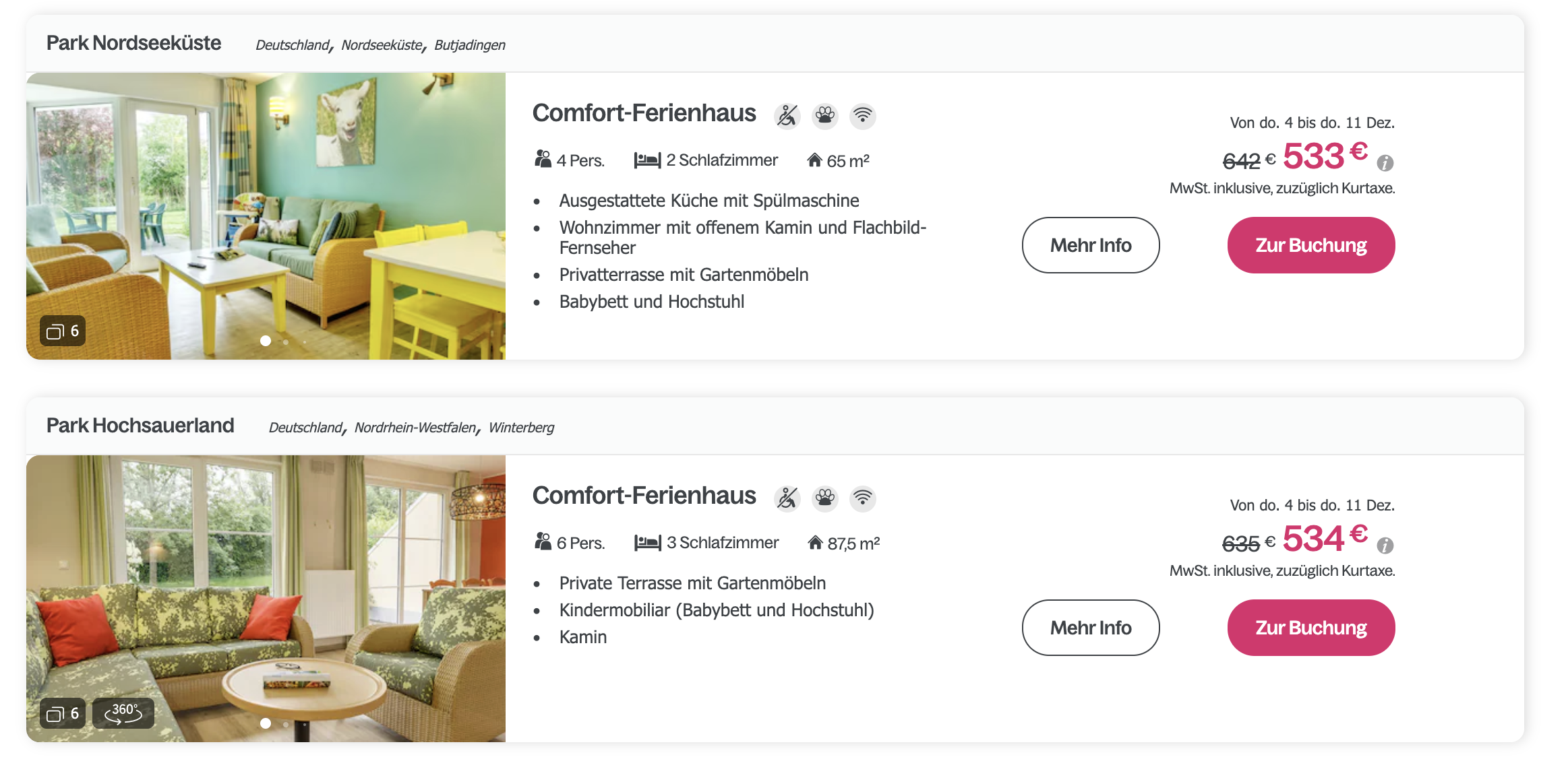 💡 Tipp: Nach der Weiterleitung könnt ihr im Filter ganz einfach den Ferienpark, Reisezeitraum und die Personenzahl anpassen, um die perfekte Unterkunft für euch zu finden. In den deutschen Ferienparks und in Dänemark essen Kinder bei Buchung der Halbpension gratis. Alle Infos findet ihr hier. 🍕