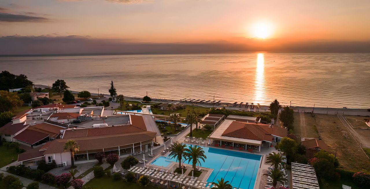 In idealer Lage direkt an der Ägäis von goldenem Sand und azurblauem Wasser umgeben, mit herrlichem Blick auf den Olymp. Klingt das nicht traumhaft? Außerdem gibt es neben einem Außenpool, auch einen Spa-Bereich mit Sauna und Dampfbad.