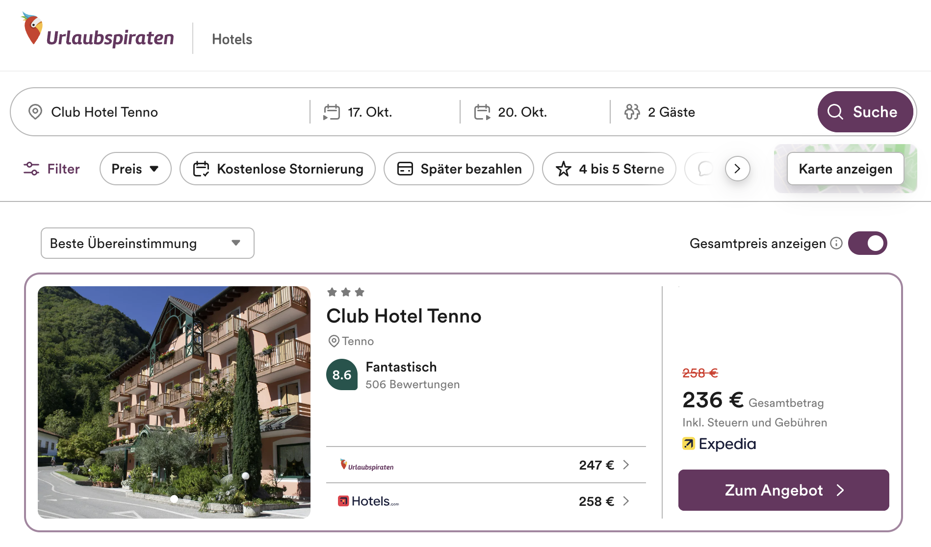 Die passende Unterkunft ist das Club Hotel Tenno. Drei Übernachtungen, zum Beispiel Last Minute über ein langes Wochenende, bekommt ihr bereits für 118€ pro Person. Das Hotel verfügt zudem über mehrere Tennisplätze, einen Außenpool und eine Sonnenterrasse.
