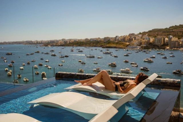 Das Hotel bietet außerdem einen traumhaften Panoramablick über die Bucht und die maltesische Küste (es gibt auch Zimmer mit Meerblick). Außerdem warten Außen- und Innenpools, ein kompletter Spa-Bereich mit Sauna und Hammam auf dich.