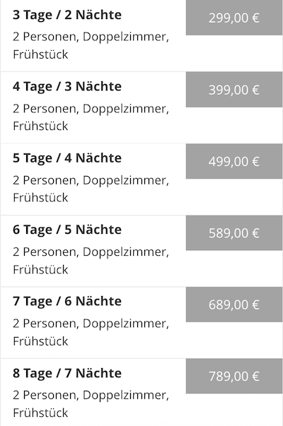 Bei einem Aufenthalt vom 29. - 31. Mai würdet ihr bei anderen Buchungsplattformen 341€ zu zweit ohne Frühstück zahlen. Bucht ihr bei Animod, sind es nur 299€ gesamt und ihr habt das Frühstück mit dabei.