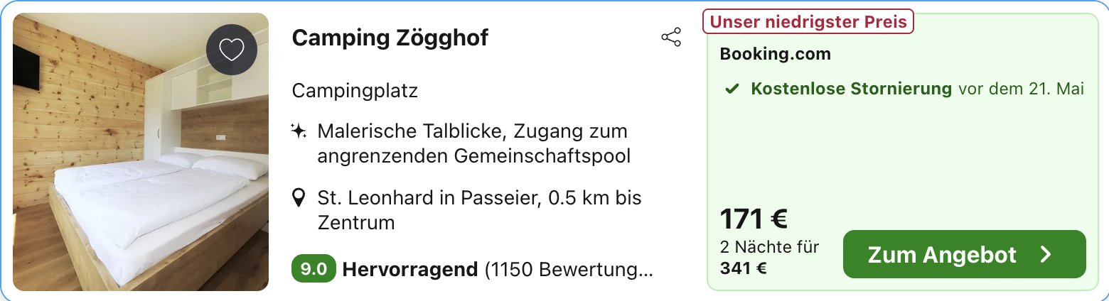 Passend dazu haben wir bei Animod ein tolles Angebot entdeckt, bei dem ihr einen Hotelgutschein für den Zögghof Sankt Leonhard in Passeier für 299€ Gesamtpreis (149,50€ p.P.) erhaltet. Enthalten sind dabei zwei Übernachtungen im modern eingerichteten Bungalow mit Küche sowie das tägliche Frühstück. Die Ersparnis lag bei unserem Preisvergleich bei über 12 Prozent!
