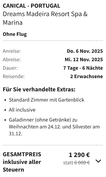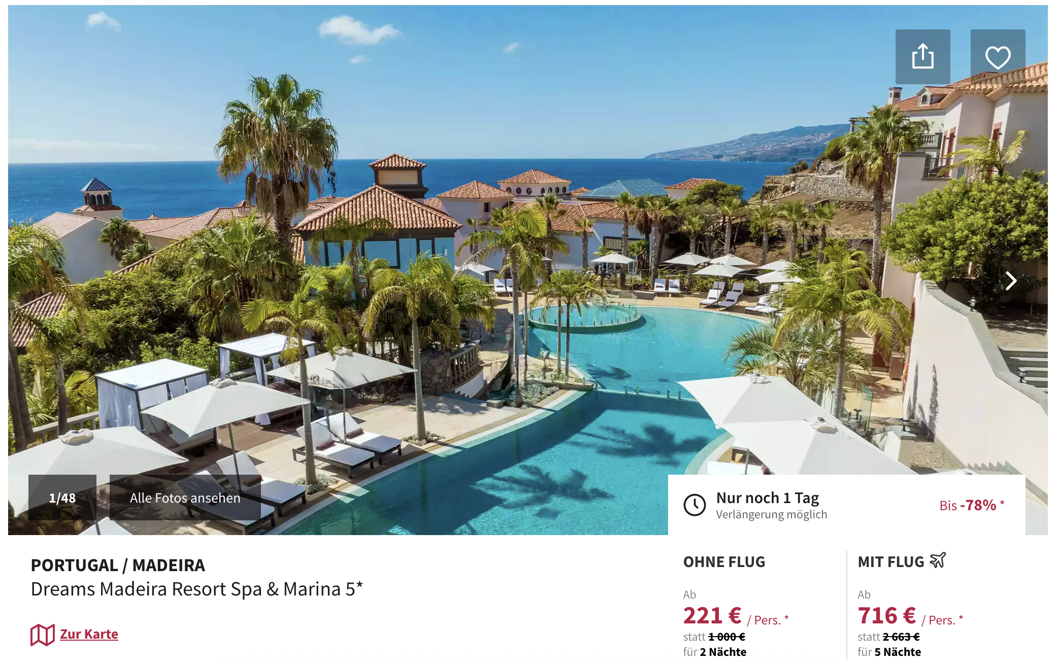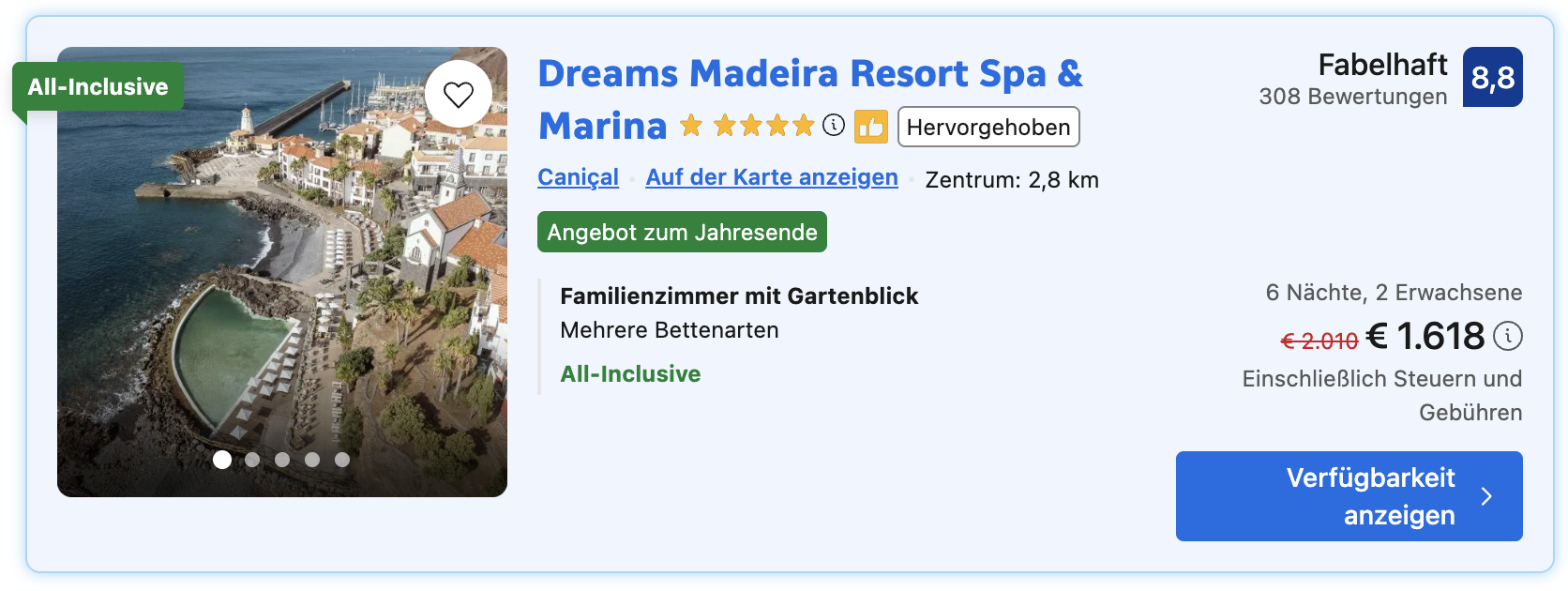 1 Woche im 5* Dreams Madeira Resort Spa & Marina – inklusive All Inclusive Verpflegung – gibt’s jetzt schon ab 645 € pro Person. Du sparst dabei rund 21 % im Vergleich zu Booking. Sowohl Last-Minute-Termine als auch Reisedaten für 2026 sind verfügbar.