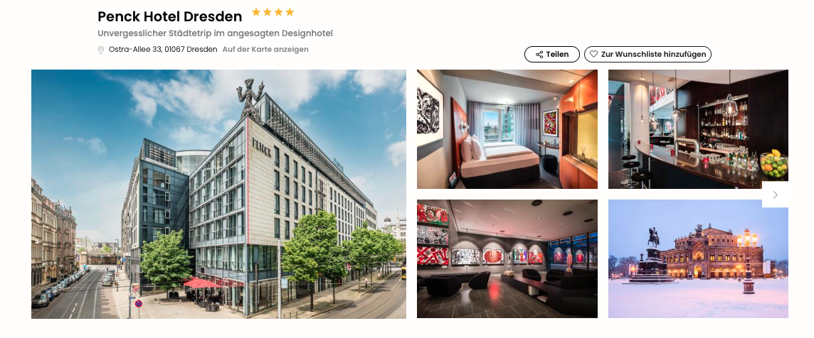 Bei diesem Deal übernachtet ihr im 4* Penck Hotel Dresden, das Frühstück gibt's obendrauf. Für gerade einmal 44,50€ p.P. kann es losgehen. Selbst in der Adventszeit gibt es noch ein paar Termine für einen geringen Aufpreis.