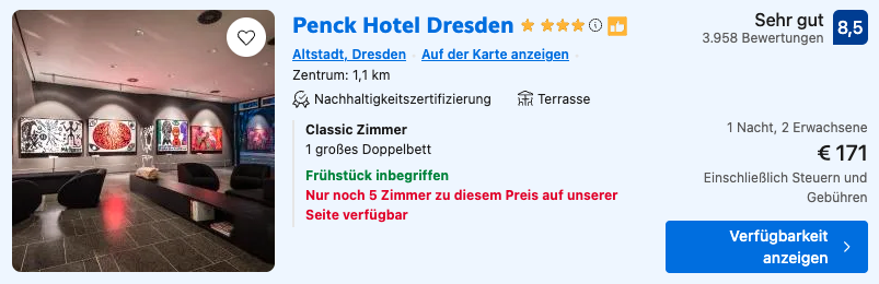 Woanders zahlt ihr am Beispieltermin 7. - 8. Dezember gleich mal mindestens 171€ gesamt, bei diesem Deal hingegen seid ihr mit 119€ dabei. Somit spart ihr mehr als 30%!